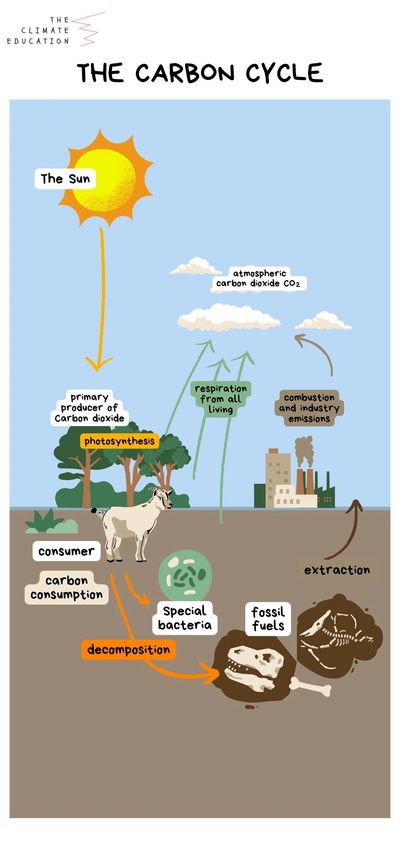The carbon cycle is the process by which carbon continually moves from the atmosphere to the earth and then back to the atmosphere. On the earth, carbon is stored in rocks, sediments, the ocean, and in living organisms. Carbon is released back into the atmosphere when plants and animals die, as well as when fires burn, volcanoes erupt, and fossil fuels (such as coal, natural gas, and oil) are combusted. The carbon cycle ensures there is a balanced concentration of carbon in the different reservoirs on the planet. But a change in the amount of carbon in one reservoir affects all the others. Today, people are disturbing the carbon cycle by burning fossil fuels, which release large amounts of carbon dioxide into the atmosphere, and through land use changes that remove plants, which absorb carbon from the atmosphere.