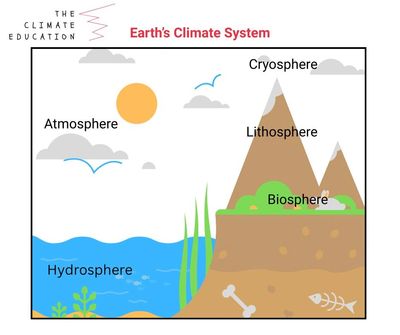Lithosphere (solid earth): Absorbs solar energy, radiates heat and stores carbon; continents and landforms help direct ocean and wind currents.